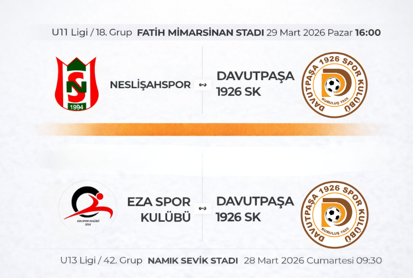 Altyapı Maç Programı U11 Ligi 18. Grup Neslişahspor – Davutpaşa 1926 SK 29 Mart 2026 Pazar 16:00 Fatih Mimarsinan Stadı